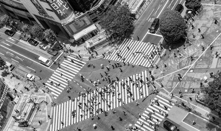 People walking on crosswalk Tokyo city street Japanese lifestyle Top view TOKYO, JAPAN - APR 21, 2019 :
