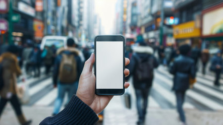 A person holding a cell phone in a busy city street. Concept of urban life and the constant movement of people