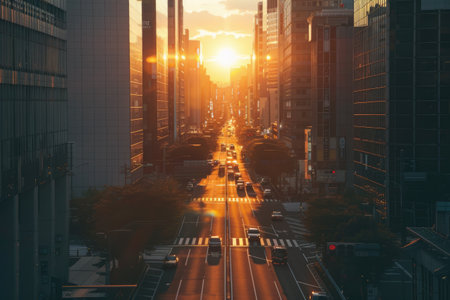 Traffic in downtown. An endless road that runs through the heart of a bustling metropolis