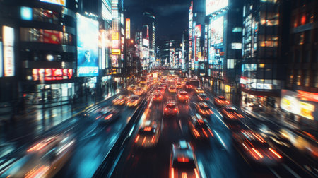 Dynamic shot of a busy urban street with moving traffic and illuminated billboards, capturing the energy and vibrancy of a city at night.