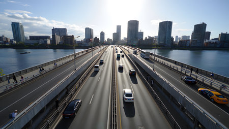 Cars drive across a multi-lane highway bridge with a city skyline in the distance Clear details a...