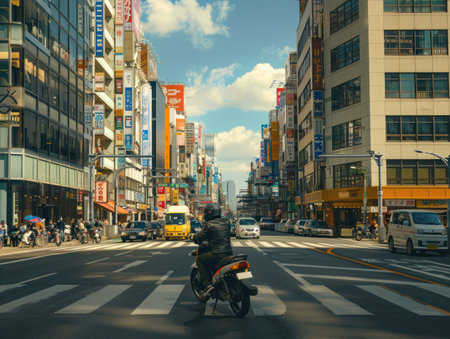 Motorcyclist rides vibrant yellow motorcycle on gray asphalt road in Japanese city. Skyscrapers and colorful signs create lively atmosphere. Clear blue sky with fluffy white clouds provides depth.