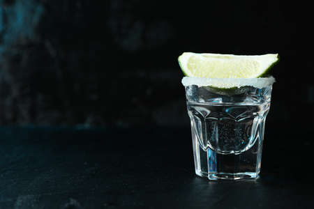 Club drink concept. Tasty alcohol drink cocktail tequila with lime and salt on vibrant dark background or glasses with tequila at a bar. Selective focus