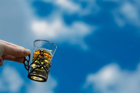 Man hand holding a glass of absinthe on bokeh background