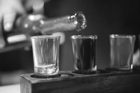 Shot glasses with liquor in the bar. Black and white.