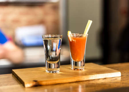 Cocktail in a glass with Tobasco and alcohol.
