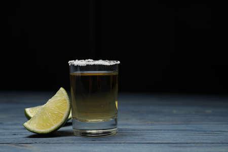 Mexican Tequila shot with salt and lime on blue wooden table. Space for text