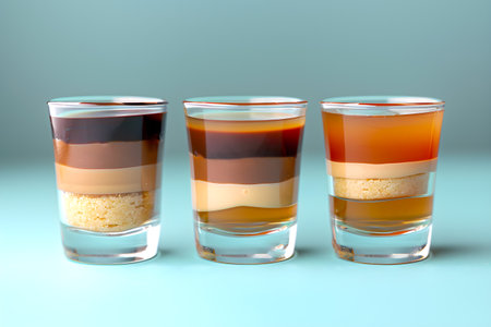 Three layered desserts in shot glasses with distinct layers of brown, caramel, and cream colors.