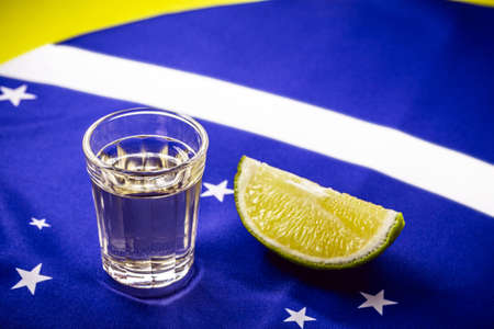 glass of distilled beverage made from sugar cane, over the Brazilian flag, concept of the national pinga and cachaça day