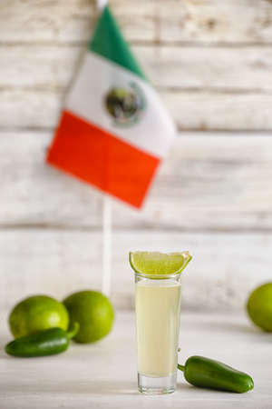 Mexican tequila shot with lime slice on wooden table. drink made from agave