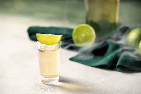 Shot of tasty mexican tequila with lime on table