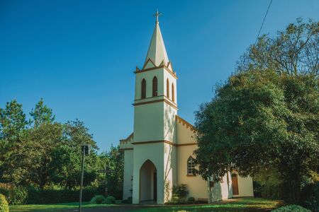 Nova Petropolis, Brazil - July 20, 2019. Facade of small church with entrance by bell tower in rural area near Nova Petropolis. A lovely rural town founded by German immigrants.