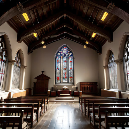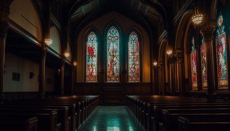 Empty church interior with wooden pews and stained glass windows illuminated by natural light