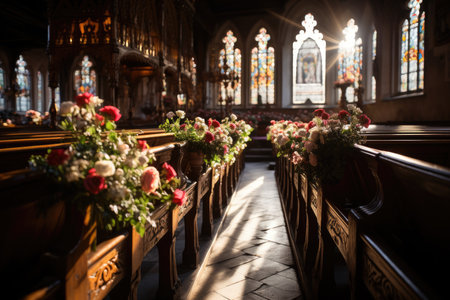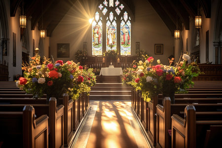 Church interior with flowers and sunlight in the rays of the setting sun