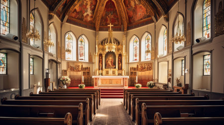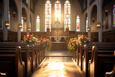 This image depicts the serene interior of a church highlighting wooden pews, a central altar adorned with flowers, and intricately stained glass windows that reflect light in the sanctuary. AI generated image