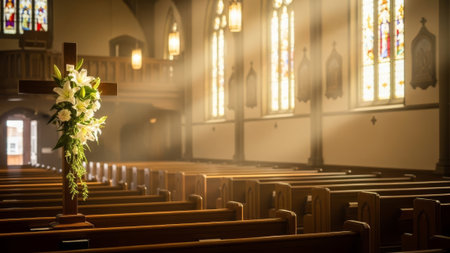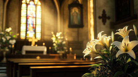 A serene interior of a church featuring elegant lilies in the foreground, soft sunlight streaming through stained glass, creating a tranquil atmosphere.