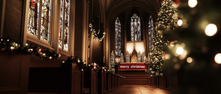 Church congregation attending service with stained glass, altar, Christmas tree.