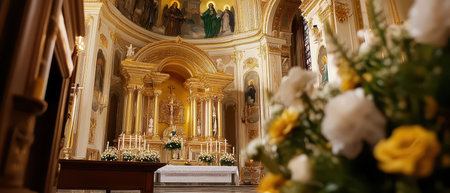 Inside a church a stunning golden altar is adorned with white and yellow flowers creating a serene atmosphere that invites reflection.