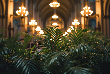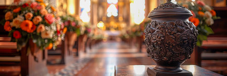 Church interior with light rays and a lot of flowers in the foreground