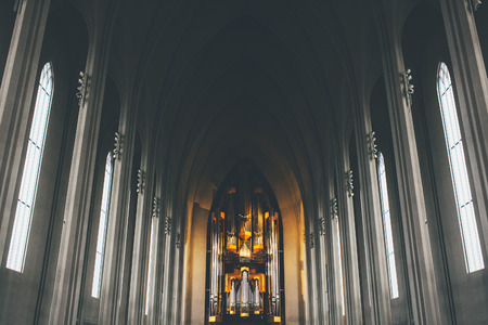 Interior of Hallgrimskirkja church in Reykjavik, Iceland. Icelandic cathedral.