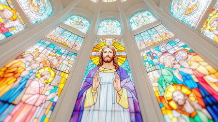 The image features stained glass art depicting Christ set in a modern church. The scene is vibrant and detailed reflecting spiritual symbolism and contemporary design elements...