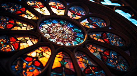 An intricate stained glass window designed with vibrant colors and detailed patterns bathes a historic chapel in soft, serene light, creating a tranquil ambiance.
