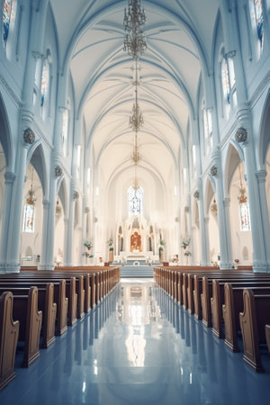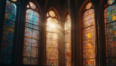 Sunlight pours through intricate stained glass windows, filling the beautiful church interior with an enchanting glow. The majestic space.