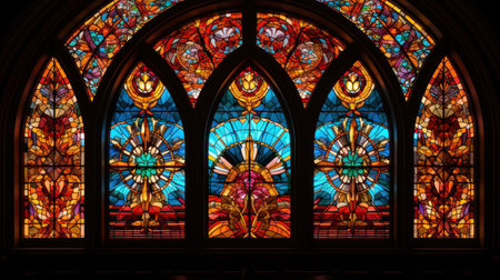 Inside the majestic Gothic style abbey, the illuminated stained glass windows illuminate the silent chapel generated by artificial intelligence