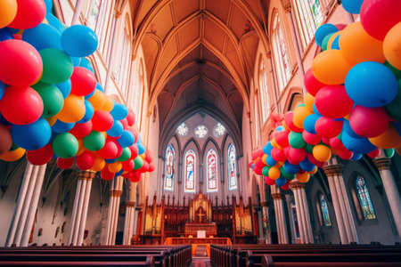An AI generated illustration of a majestic church with an abundance of large colorful balloons