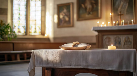 Simple Wooden Cross on Altar with Candle in Sunlit Church Interior. Concept of Spiritual Reflection, Religious Heritage. Ash Wednesday.