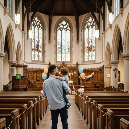 A heartwarming scene of a father holding his child in a church aisle, surrounded by birthday balloons and banners, capturing a joyful moment of family celebration and love.