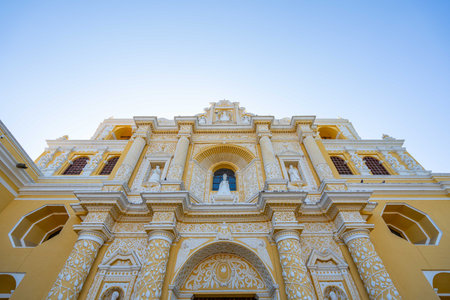 A low angle shot of the blue sky on the top of a historic building in Antigua Guatemala