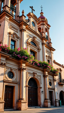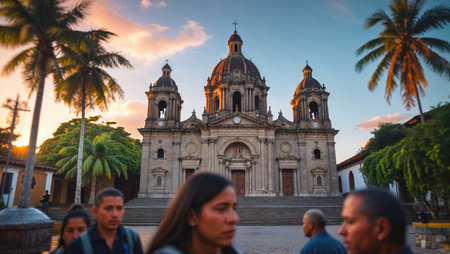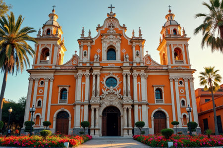 Vibrant colonial architecture of historic church with palm trees and flowers at sunset. That the image is generated using AI.