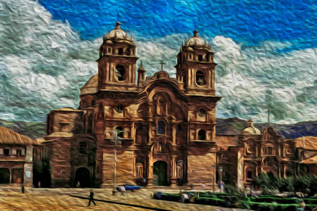 Baroque style Cathedral at the Plaza de Armas, in the historical city center of Cusco. The ancient capital of the Inca Empire in Peru, that became a major tourist destination. Oil paint filter.