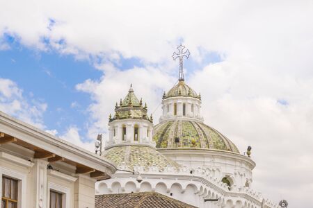 Low angle view of domes of the metropolitan cathedral at the historic center of Quito in Ecuador.