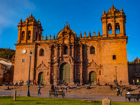 Sunset in Main Square (Plaza de Armas) in front of the Cathedral facade. City of Cusco, Peru