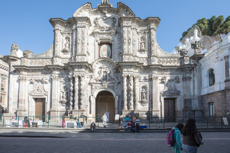 Quito Ecuador April 2018: Facade of Compania Chrch, a Jesuit church in Quito. It is among the best known churches in Quito because of its large central nave