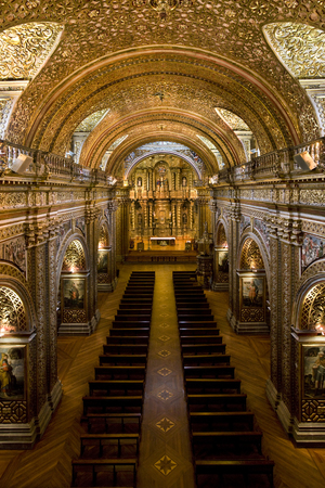The interior of La Compania Jesuit Church in Quito in Ecuador, South America. Much of the ornate sculpture is made from local volcanic pumice which has then been covered in gold leaf (supposedly 7 tons of it)