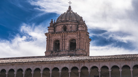 An ancient colonial monastery. A bell tower with a dome and a cross against a blue sky, clouds. A gallery with columns and arches. Inca stonework and Spanish Baroque architecture.
