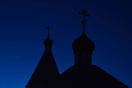 Silhouette of domes with crosses of Orthodox church against the blue sky in the evening