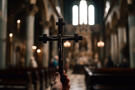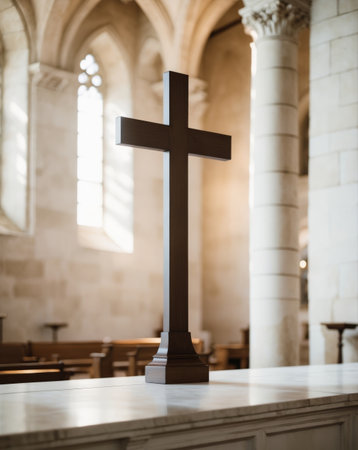 AI Generated. Cross in Historic Church Interior with Soft Lighting