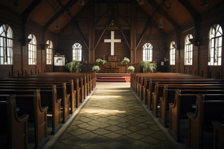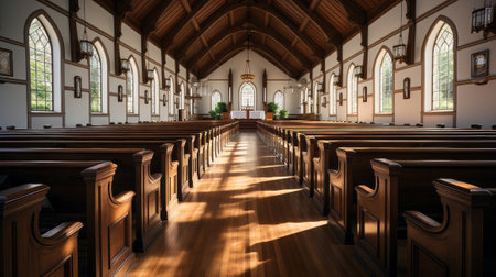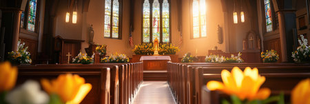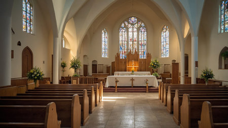 This image depicts the serene interior of a church highlighting wooden pews, a central altar adorned with flowers, and intricately stained glass windows that reflect light in the sanctuary. AI generated image