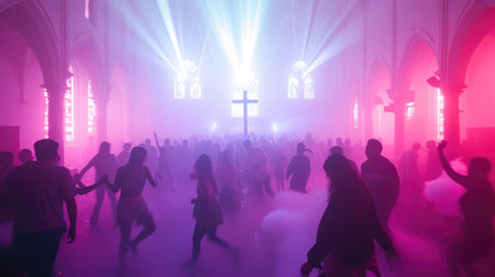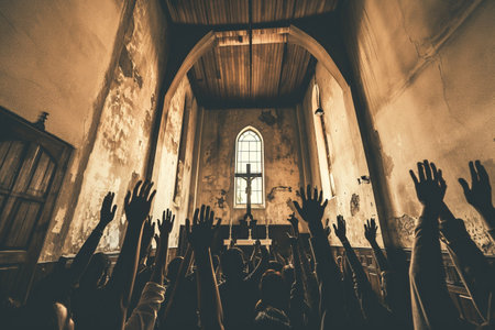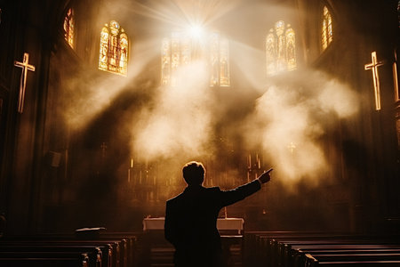 Priest is pointing towards the bright light shining through stained glass windows of a church during a sermon, creating a powerful atmosphere of faith and spirituality