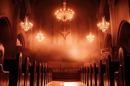 Warm orange light illuminates the interior of a church, highlighting the pews, crucifix, and crystal chandeliers, creating a serene and spiritual atmosphere