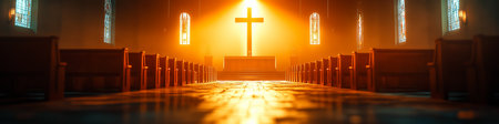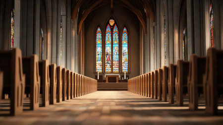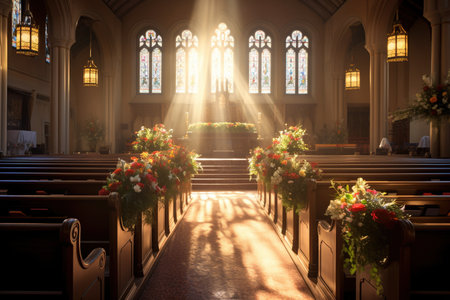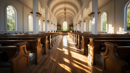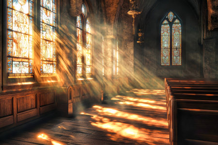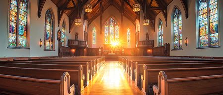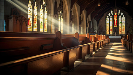 Sunlight pours through intricate stained glass windows, filling the beautiful church interior with an enchanting glow. The majestic space.