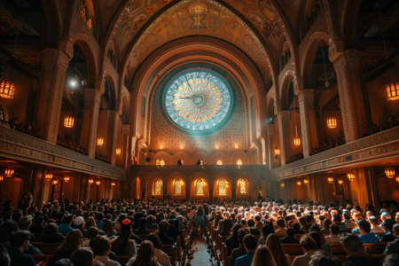 A large congregation gathers in a beautifully lit church for a spiritual service, showcasing intricate architecture and vibrant stained glass