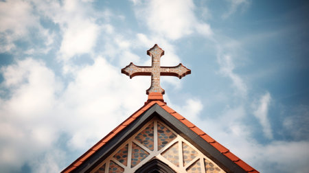 A low angle shot of a religious red-roofed building with a cross on top under a cloudy blue sky