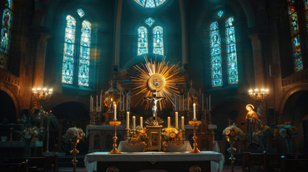 Elegant altar in a church, adorned with a radiant monstrance, candle, and chalice, under soft lighting and stained glass windows