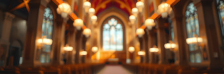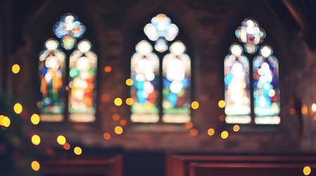 Sacred atmosphere with a blurred church interior, focusing on colorful stained glass and wooden pews.