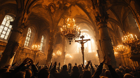 A wide shot of a traditional Easter Sunday service in a large cathedral, with worshippers gathered for prayer and reflection in front of a large cross.